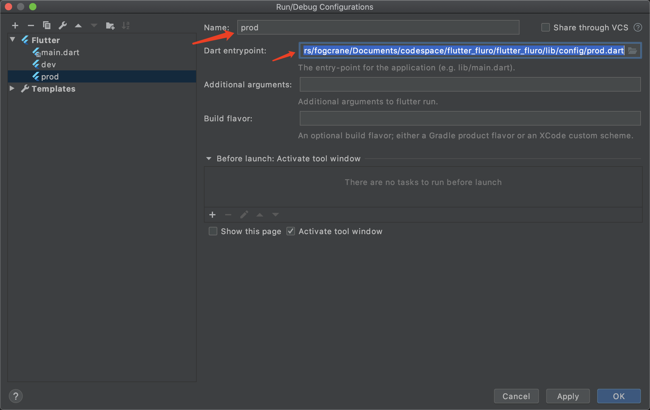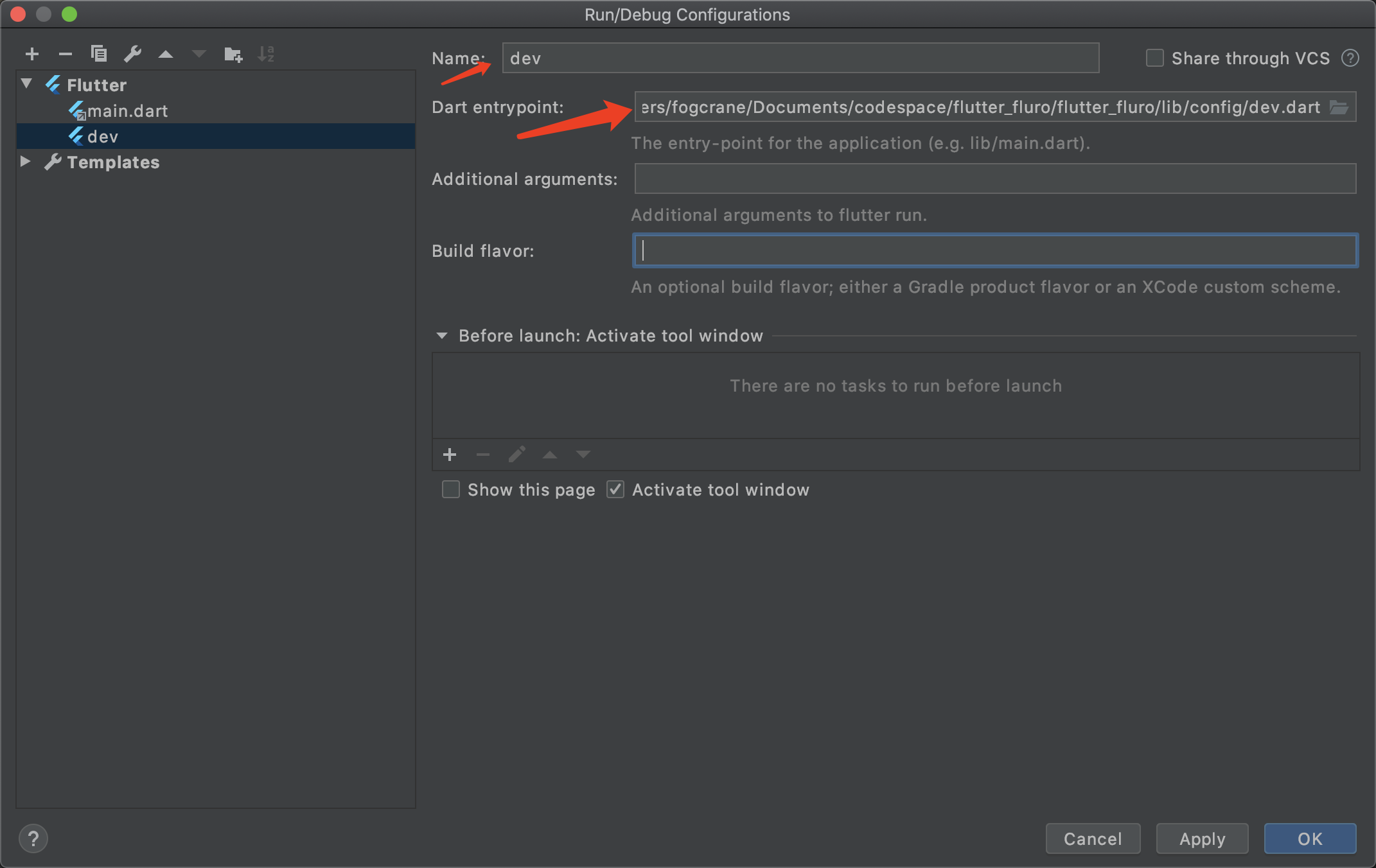 dev和prod环境。新建dev.dart以及prod.dart,分别作为开发环境以及生产环境的构建脚本。代码如下:1// dev.dart2import 'package:flutterfluro/main.dart';3import 'package:flutter/material.dart';4import 'package:flutterfluro/config/config.dart';56void main() {7var configuredApp = new ENV(8appName: 'flutter_fluro_dev',9envName: 'dev',10baseUrl: 'http://127.0.0.1:9991/v1',11child: new MyApp(),12);13runApp(configuredApp);14}