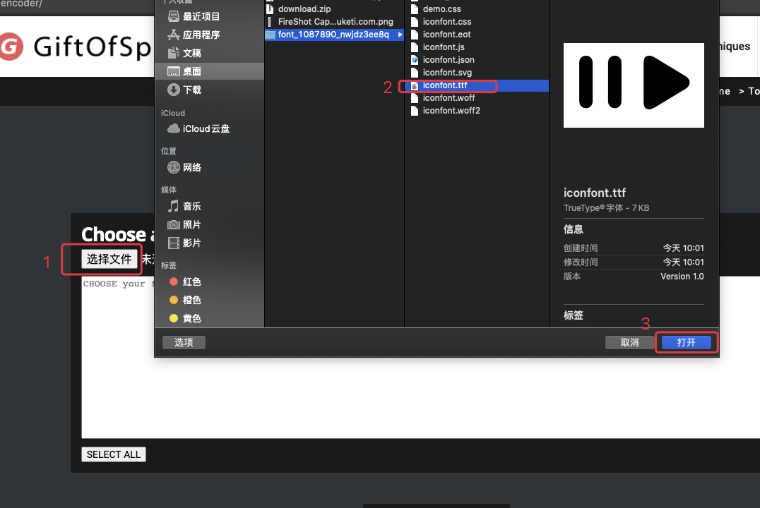 打开 base64 encoder 网址,解压上一步骤下载的文件,选择其中的字体文件iconfont.ttf,如下图所示:![]()